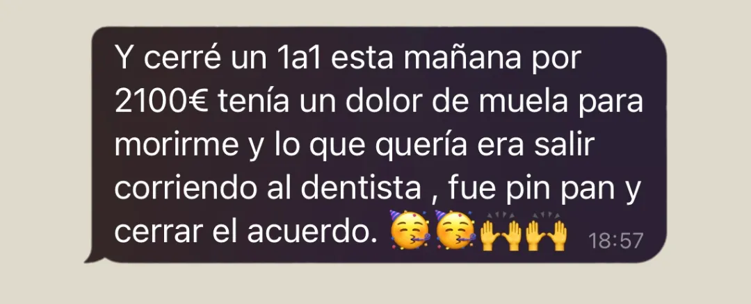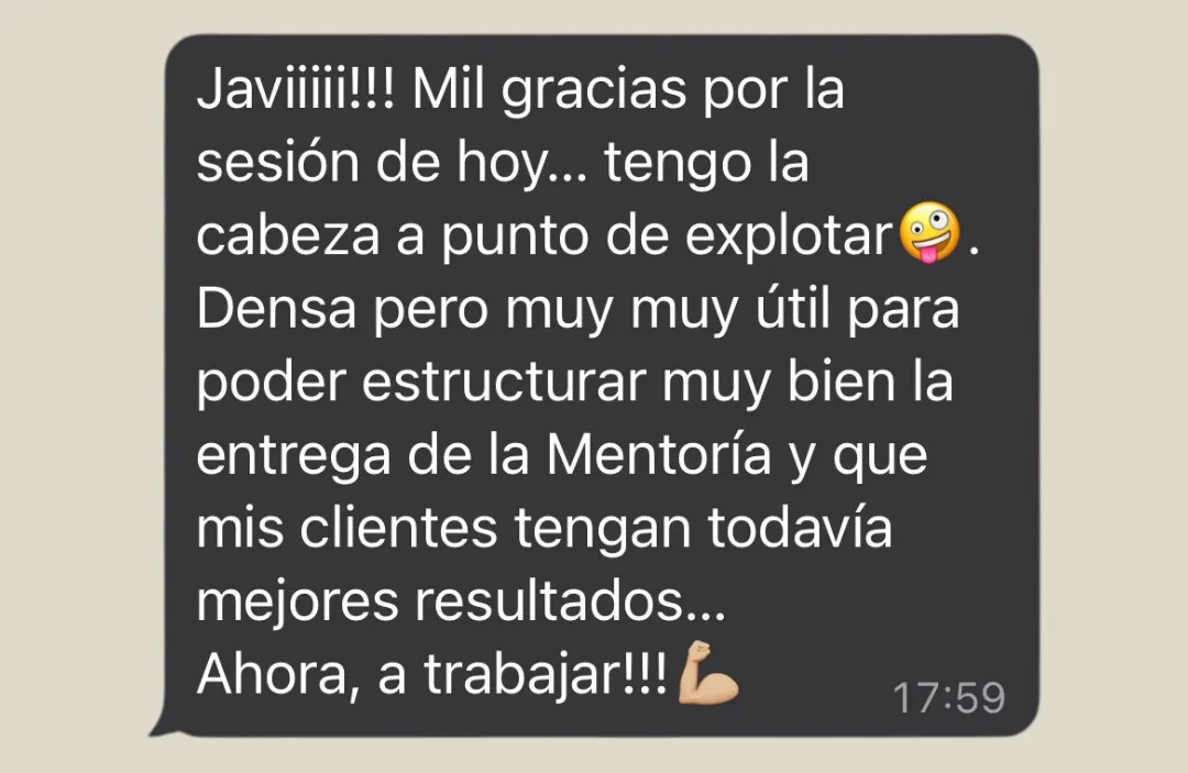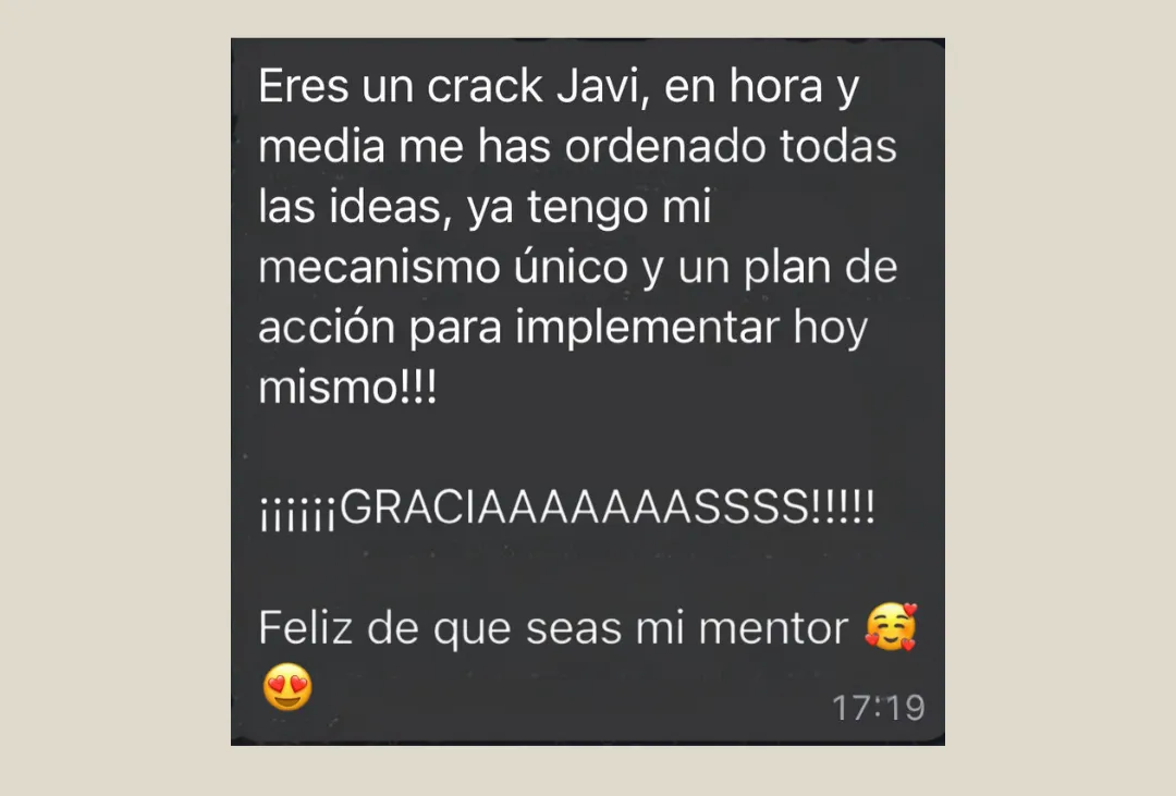 "Javi puso, además de mucho cariño en mi negocio, puso mucho orden, mucha mentalidad de ingeniero, de poner orden en mi formación, decidir cuáles eran los pasos a seguir y encontrar mi mecanismo único. Gracias a eso conseguí vender mucho más, no tanto por la estrategia, sino porque ahora estaba convencido de que mi método era claro y daba resultados".