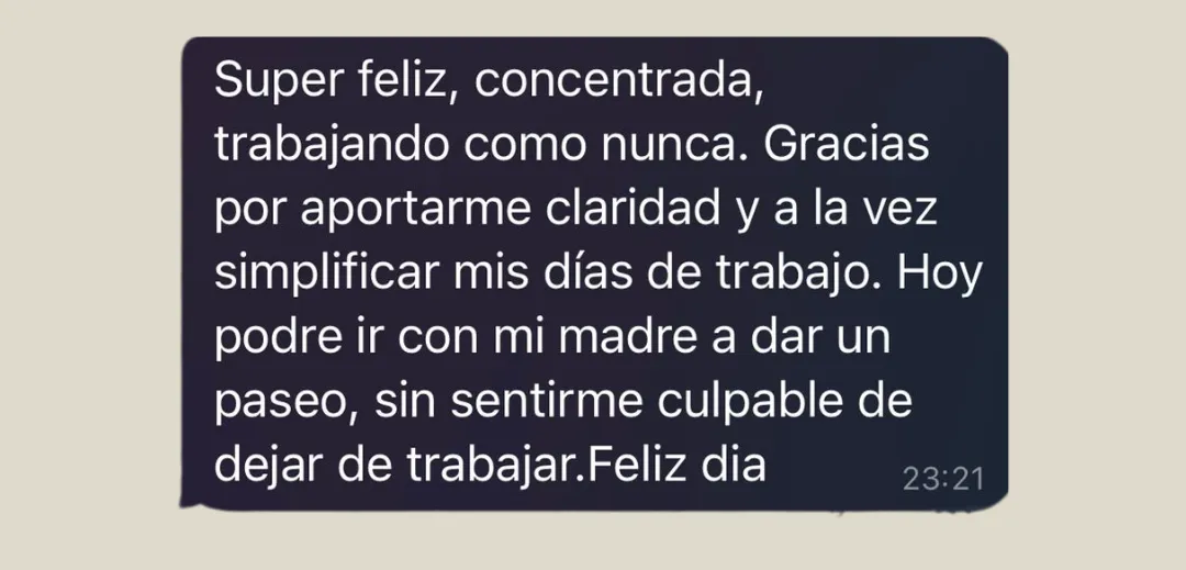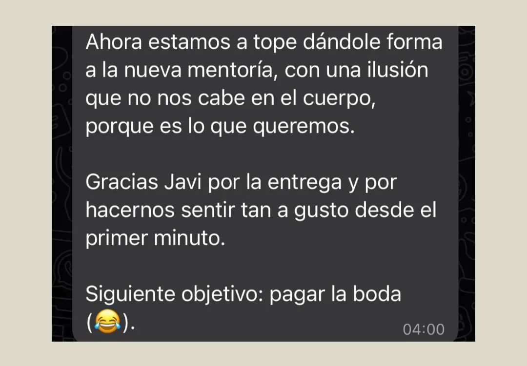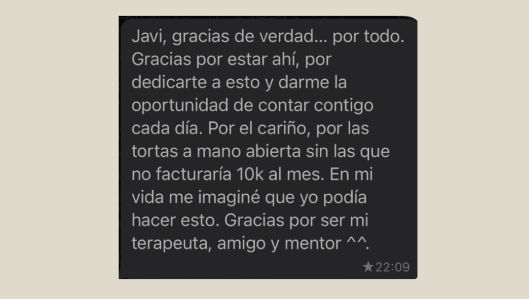 "Javi es un mentor que trabaja de una manera completa y para mí eso es más importante que exclusivamente los resultados, que por supuesto son importantes. Pero tener bienestar emocional, tranquilidad y seguridad, creo que realmente para eso queremos el dinero, para sentirnos bien."
