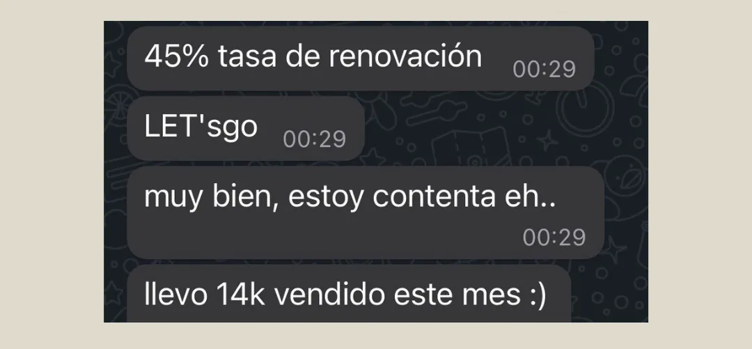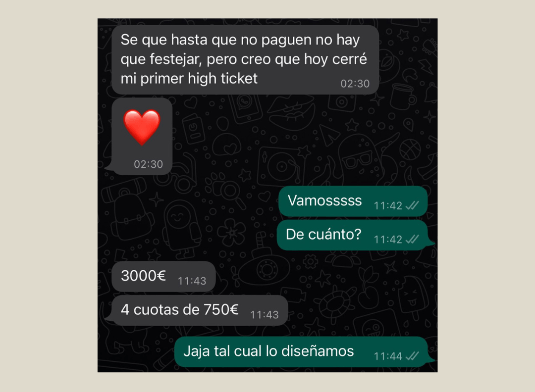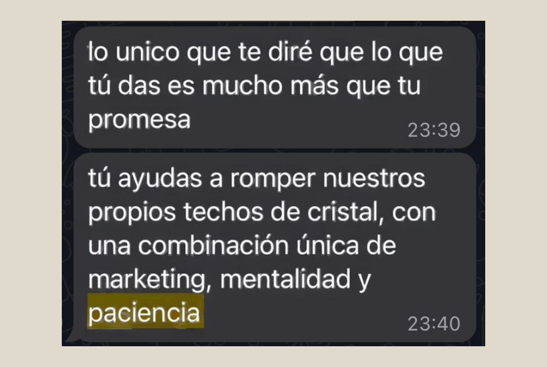 "Trabajar contigo me ha cambiado la vida. Pero a niveles de que me ha hecho mejor persona. Yo me trataba super mal, veía las cosas de otra manera... Y ya no es que pases de 10.000 euros al año a 10.000 euros al mes sino cómo experimentas eso".