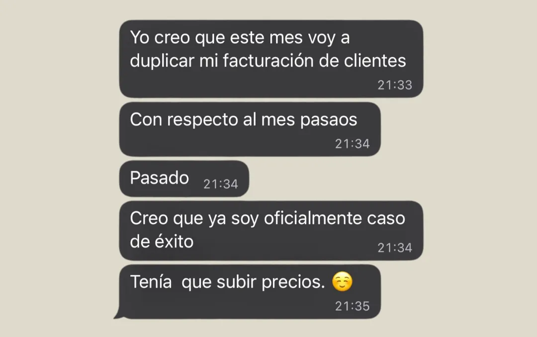 "En menos de un mes, había pasado de facturar €200/300 y pasé a facturar €7000. O sea eso fue increíble. Después de 6 meses trabajando con Javi, puedo decir que me siento muy alineada con mi negocio, tengo muy en claro qué es lo que quiero conseguir con mi negocio.